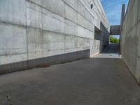 A modern urban plaza in Zaragoza, Spain. The concrete walls create a stark contrast against the clear blue skies. The hard shadows add depth and texture to the urban design. A perfect blend of modern architecture and open space.