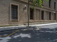 Classic architecture in Zaragoza, Spain. The city's urban design features a brick wall warehouse. Hard shadows highlight the storerooms and depot. A bustling European city known for its vibrant city life.