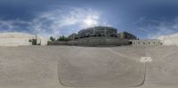 A skate park in Zaragoza, Spain, with modern architecture and open spaces. The city's urban design is showcased in this high position aerial shot. Hard shadows and the sun's glare add artistic elements to the scene.