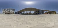 A mirror image of a large building in Zaragoza, Spain. The multicolored modern architecture stands out against the clear sky. The urban design of the business district features concrete surfaces and hard shadows.