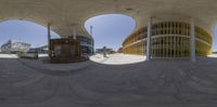 A modern architecture in Zaragoza, Spain. The business district showcases a multicolored plaza with open spaces. Clear skies create hard shadows on the concrete surfaces. A dynamic urban design in the heart of Europe.