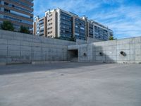 the empty parking lot in front of a wall with apartment buildings on it and a skateboarder on a ramp