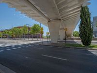 An urban road in Zaragoza, Spain, flanked by modern architecture. Clear skies cast hard shadows on the asphalt, creating a striking contrast. The road leads under a bridge, showcasing the architectural brilliance of the city.