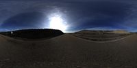 a panorama view of an asphalt road and hills, at the time of a full moon, with an orange fire