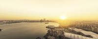 Aerial view of Zhuzhou cityscape at dawn. Modern architecture stands tall against the horizon, reflecting in the calm waters of the lake. The sun visible in the sky adds an emotional touch to this urban scene in Jiangsu, China.