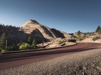 A stretch of empty highway in the wilderness of Zion National Park, Colorado. Lined with boulders and trees, it offers a breathtaking view of the desert landscape and the majestic mountains. A perfect day to explore Mount Zion.
