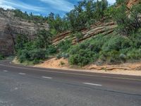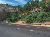 Scenic road in Zion National Park, Utah, meandering through breathtaking mountain landscapes. Clear sky, fluffy clouds, and pristine nature surround the asphalt. An idyllic day for a drive in the USA.