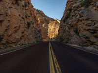 Straight down the road in Zion National Park, Utah. The asphalt road cuts through the picturesque landscape, casting hard shadows. A perfect day for exploring the natural beauty of the USA.