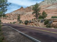 A road winding through the scenic landscape of Zion National Park in Utah, USA. The clear sky and majestic mountains make for a perfect day in nature. The asphalt road stretches for one quarter, inviting exploration.