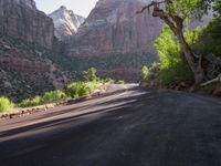 A cyclist rides along the scenic road in Zion National Park, surrounded by lush green trees and majestic mountains. The steep red rocks form a dramatic backdrop to this picturesque landscape.