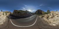 this photo shows a wide angle view of the landscape of a road in the mountains