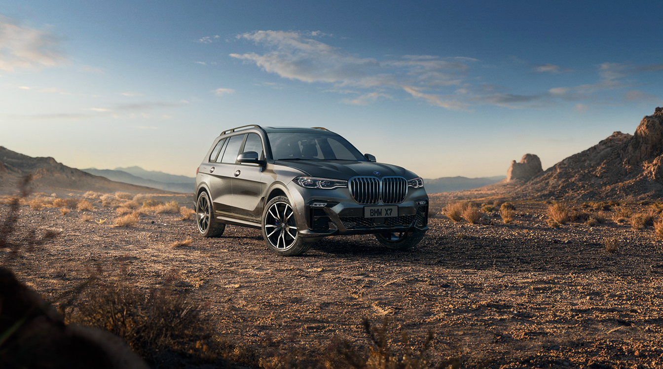 Vinicius also shows the X7, beautifully lit from behind, in a desert setting. This render demonstrates the rugged side of the vehicle, which is appealing to customers of full-size SUVs who might be considering the X7.