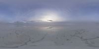 a fish eye view of a long gravel road in mountains surrounding a large cloud,