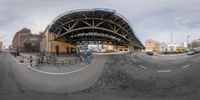 a fish eye view of an outside space with cars parked in the road and a bridge overpass