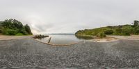a fisheye lens photo shows a curved road with trees and water in the distance