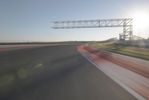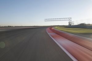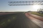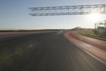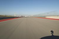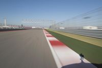 A bright red automobile races down a highway in the early morning sun, its motion blurred against the curved dome of a stadium in the horizon. This infrastructure is a part of the fixed link between different modes of transport, from air travel to asphalt runways and fields, providing a map to the atmosphere of motion and speed.