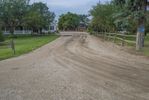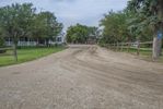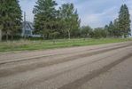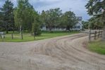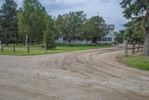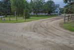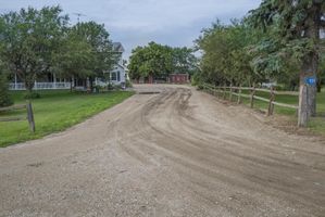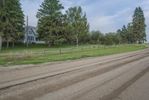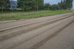 A section of US soil reveals a mixture of asphalt, gravel, and dirt that make up a rural lane in the countryside of Bancroft, Iowa - with a grey sky above and a tree-lined path leading to a field of agriculture. The infrastructure of the road surface offers transport and connection in this rural area.