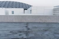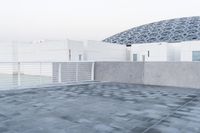 An impressive view of the cityscape of Abu Dhabi, United Arab Emirates, with a concrete paver street surface, building facades, window lines, and a Louvre-style structure in the foreground. The clear blue sky provides a perfect backdrop to the architectural structures and open space of the area.
