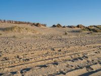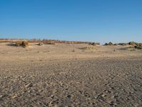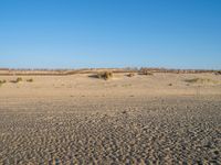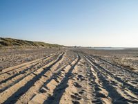 Dawn breaks over a vast open landscape of sand dunes, grass prairies, and plateaus on the Dutch coastline. The combination of the azure sea, clear sky, and the tints and shades of the ocean wave create a calm, serene atmosphere in nature's natural environment.