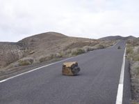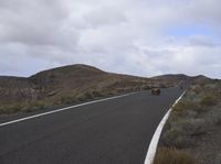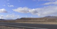 Aerial view of a S-curve highway with an Armco barrier in Fuerteventura, Spain, surrounded by the sandy desert of the Sahara. The land is full of diverse landscapes, from mountains to beds of gravel, and the sky is a mix of blue and grey. The highway is surrounded by a rugged terrain of bedrock, grass, and soil, with the sun shining down from above.