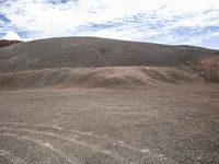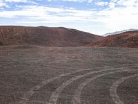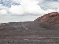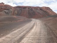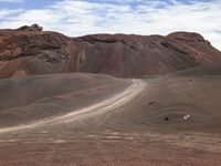 A winding mountain road with sand, dirt, gravel and asphalt surface textures in the open space creates an off road track with tints and shades of brown and grass, leading to a horizon of mountain ranges and cumulus cloud formations.