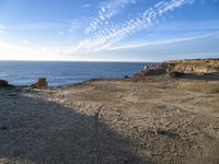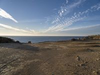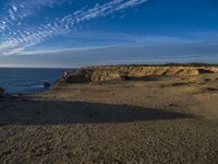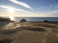 A peaceful morning on the coast of Portugal reveals a vast landscape of aeolian landforms, including bluffs, crags, and outcrops, in the warm sunlight of a red sky at dawn. A winding road runs between the grassy surface and the gravel beach, while the azure ocean meets the shore and waves lap against the bedrock.