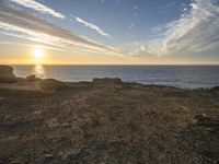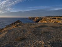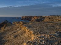 The azure sky and red afterglow illuminates the aeolian landforms in Portugal, including the beach, bluffs, cliffs, grass, gravel, lake, mountains, ocean, outcrops, plains, roads, sand, shore, slopes, sun, surface, terrain, trees, vegetation, and water at the break of day.