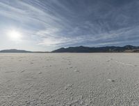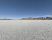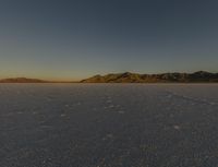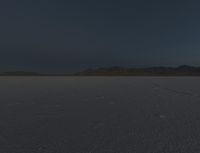 The calm atmosphere of the winter night on the Bonneville Speedway near Salt Lake City, Utah, USA, is illuminated by the afterglow of the azure sky, with the contrast of the black asphalt road surface running across the dry desert and two-lane salt lake. The frozen plain is framed by the mountain landforms and mountain range in the background, with a few trees and water resources in the horizon, with the coastline and sea shore in the distance.