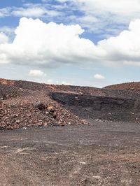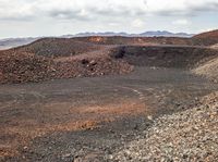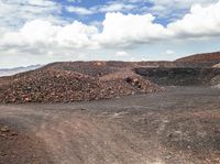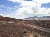 An aerial view of an off road track winding through a makhtesh, a geological phenomenon in the highlands of Israel. A variety of landforms, including mountains, hills, and valleys, are visible in the landscape, along with a patchwork of vegetation, grass, rock, soil, gravel, asphalt, and a lake. Cumulus clouds drift across the sky, illuminated by the warm sunlight of a bright day.