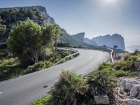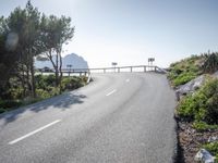 An elevated view of the Balearic Islands in Spain, featuring a winding highway, a guard rail, a lake, a harbor, and surrounding trees, vegetation, and mountains. The clear sky is filled with a few contrails, and the sun shines brightly on the asphalt road surface.