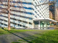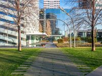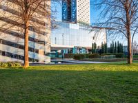 An aerial view of Barcelona's bustling business district with modern office buildings and straight roads.