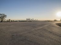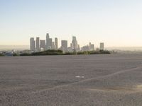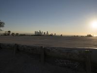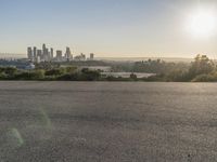 A clear sky reveals a metropolitan area with a road surface, boardwalk, and a shoreline near a mountain range with sunlit grass and trees. The cityscape provides a unique view of the urban environment and its water resources.