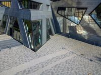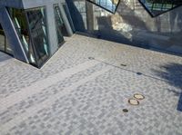An elevated shot of a futuristic architectural structure in a modern city, showcasing the urban design and top-down view.