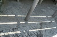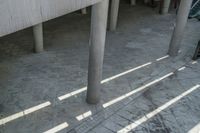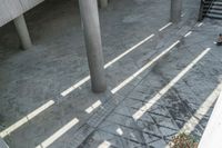 A top down view of Guangzhou, China, from an elevated position reveals the city's concrete wall and open space, with hard shadows cast across the paver surface during the day.