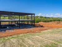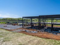 An elevated aerial shot showcasing a high-rise building and road in the USA on a sunny day with clear skies.