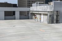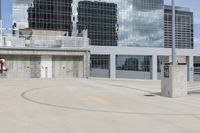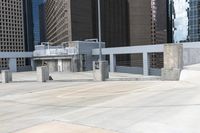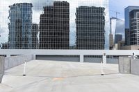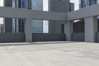 An aerial view of a high-rise building in the USA, with a modern cityscape of concrete, asphalt and composite materials in the background. The skyline is dominated by Dallas, Houston and other large metropolitan areas. The view includes a parking deck, walkway, handrail, roof and other features of Brutalist architecture typical of many urban properties in the US.