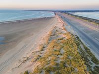 An elevated aerial view of the Netherlands' shoreline reveals a unique pattern of dunes, sand, lakes, and natural environment at the break of day. The azure waters, fluid horizon, and bright sunshine of the sunny day create a stunning contrast to the open space of the desert terrain and asphalt road surface.