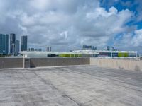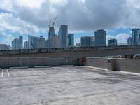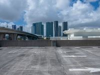 A top down view of the parking deck and urban design of Miami Beach, Florida, USA, with an open space of asphalt and a cityscape in the background.