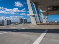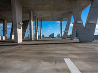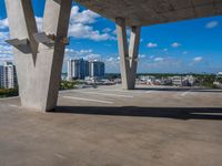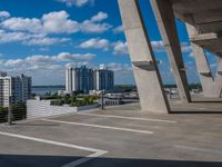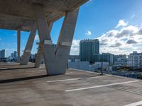 An elevated top down view of Miami Beach, Florida with skyscrapers, parking lots, and open spaces visible in the sunny cityscape.