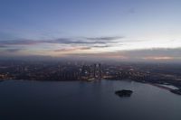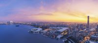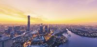 City skyline with modern architecture and skyscrapers reflecting on the water at dawn in Zhuzhou, Jiangsu, China, Asia.