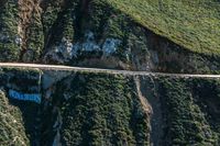 A winding road along the Pacific Coast Highway, surrounded by rugged highland terrain, outcrops of rocks, and clear blue sky. A bridge and several switchbacks provide controlled access to the mountain pass, with views of the coastal biome and mountain range reflected in the reservoir below.