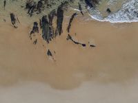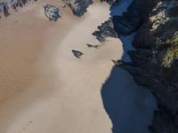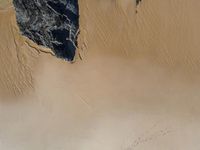 High above the coastal beach of Portugal, an aerial view of the glacial nunatak's rocky surface and sandy shore reveals a fluid landscape of lake and ocean waters, mountain ranges, and a variety of natural landforms. The awe-inspiring atmosphere of this world of tints and shades paints a picture of the unique aeolian geology and grey plaster footprints of the environment.