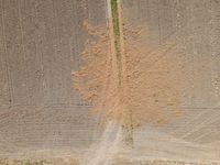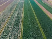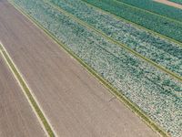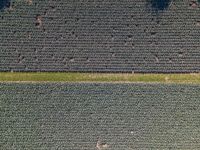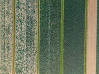 An aerial view of a landscape in Holland, featuring lush vegetation, rural farms, parallel lines of asphalt, concrete and tar, and a composite material of grey, blue, beige and brown tints and shades. The open space includes a variety of grass, soil, metal and wood surfaces, with a pattern of terrestrial plants and water. Incidental people can be seen in the elevated top down view.