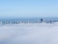 A stunning aerial view of San Francisco, California, USA, showing the cityscape on a clear day with fluffy clouds floating above the skyline.