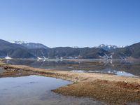 An aerial view of the ancient Shangri-La in Yunnan, China, featuring the Moraine landscape, glacial massif, grassy badlands, winding river, and mountain range. The clear winter sky reveals a beautiful natural environment of alps, soil, and water resources.