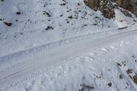 An elevated view of a snowy mountain landscape in Italy, showing a road winding through the terrain