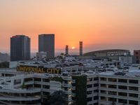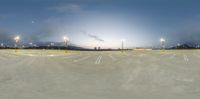 A top-down view of a residential suburb of Los Angeles, USA, illuminated by the rising sun. An elevated parking deck and asphalt road curve through the parking lot below.