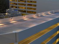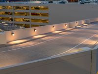 An elevated view of a residential neighborhood in Los Angeles, USA, featuring a parking deck and street lights in the break of day. Artificial light illuminates the asphalt road and driveway from a top down profile, while clouds hover above in a one quarter angle.