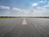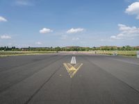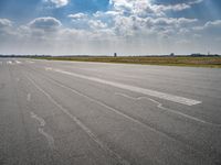 Aerial view of Tempelhof, a former airport located in the city of Berlin, Germany, now used as an art district, park and natural environment. The scene is of a clear sky with cumulus clouds, a lake, asphalt roads, residential areas, fields with vegetation, and a grass surface.