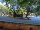 a cobblestone road lined with trees and buildings in an apartment complex courtyard area